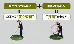 「グリーンを狙える横風にも強い弾道は、スピンが適度にかからないとダメ。ロフトの少ない番手で軽く打つとか、ボール位置を右に寄せる、ではスピン量がコントロールできません。
