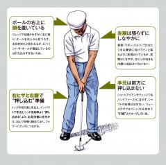 ウェッジでも頭がわずかに右に寄り、ボールを右上から見下ろす。右目利きだと思われるが、ビハインド・ザ・ボールが徹底しているのは打ち込みすぎないため。