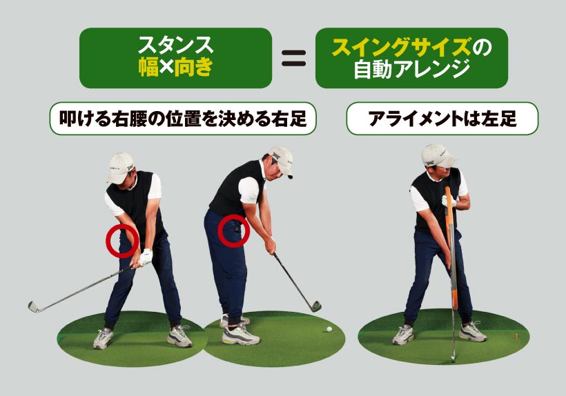 「バックスイングで右ヒジを引き、ダウンでリリースするには右腰との一体感が重要。スクエアスタンスでは、長い番手では右ヒジの動く幅が物足りなく、ショートアイアンでは広すぎて、どちらもタイミングが合わない。そこを腕や手の動きで調整するのではなく、右足の置き方で右腰のターン量を変え、スイングのサイズ感を変えたんです。といってもバランスを崩さない範囲なので、右足を前後させるのはボール1個幅、4センチ程度で十分です」(森)