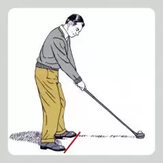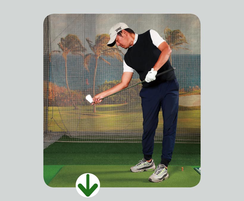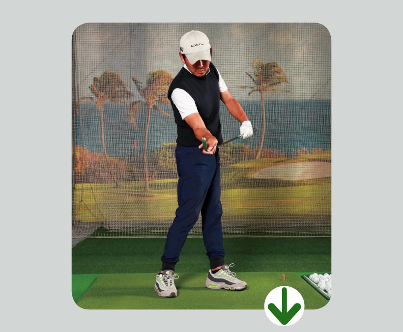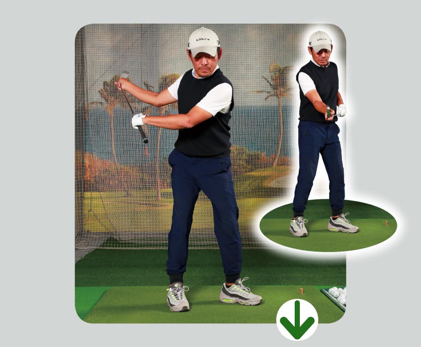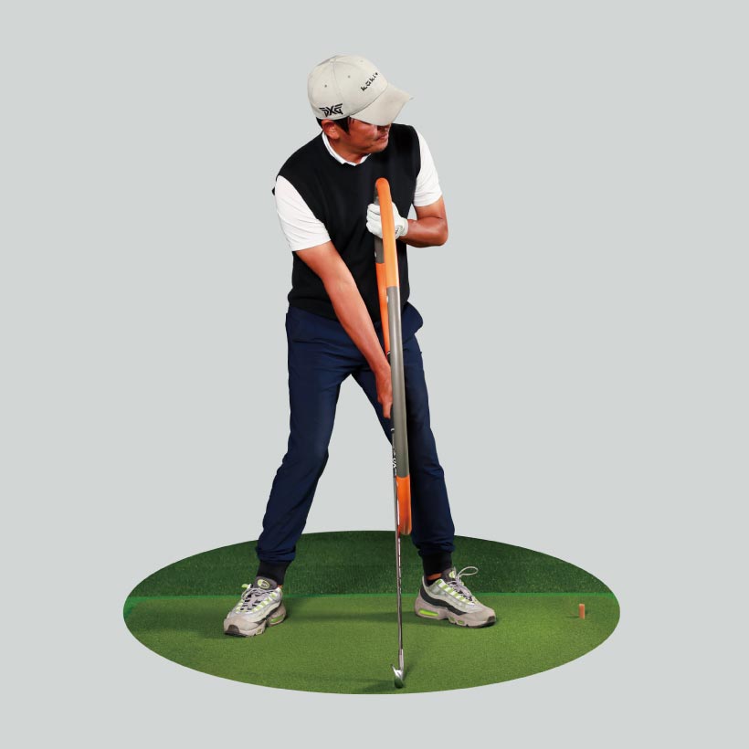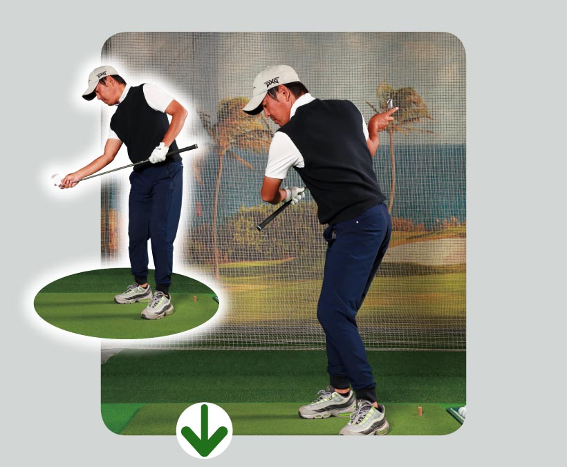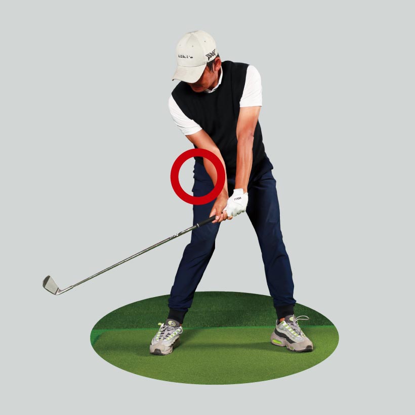 オープンスタンスで右腰を前に出し、後ろに引きにくくすることで、バックスイングでのターンを抑制。結果、右ヒジも背中側に引けず、手元が高く上がり、トップも高くなる。