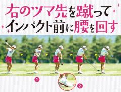 ❷ 右のツマ先を踏むことでダウンスイングが下半身リードになって、腰を力強く回転できる。