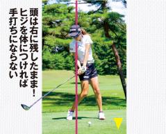 「右腰を回すときでも、右腰がボールに近づきすぎると体が突っ込んでしまうので、アドレスの位置に腰を戻すようにしましょう」