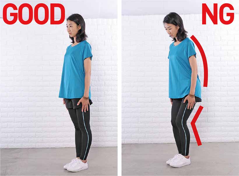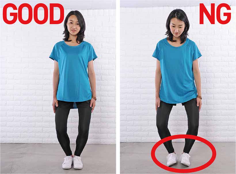 1.足を閉じ、つむじを上、尾骨を下にして、背骨をスッと伸ばして立つ。へそは背骨に引き込み、お腹を凹ませる。骨盤底筋も締めて引き上げ、お腹とお尻の筋肉で骨盤を立てる。