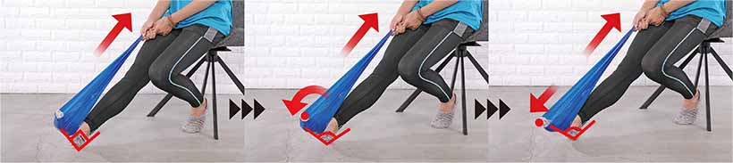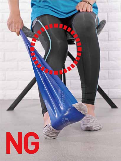 3.口から息を吐きながら拇指球でセラバンドを内側に引っ張り、足首を内側に倒す。