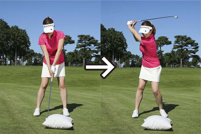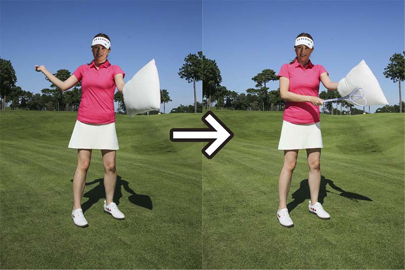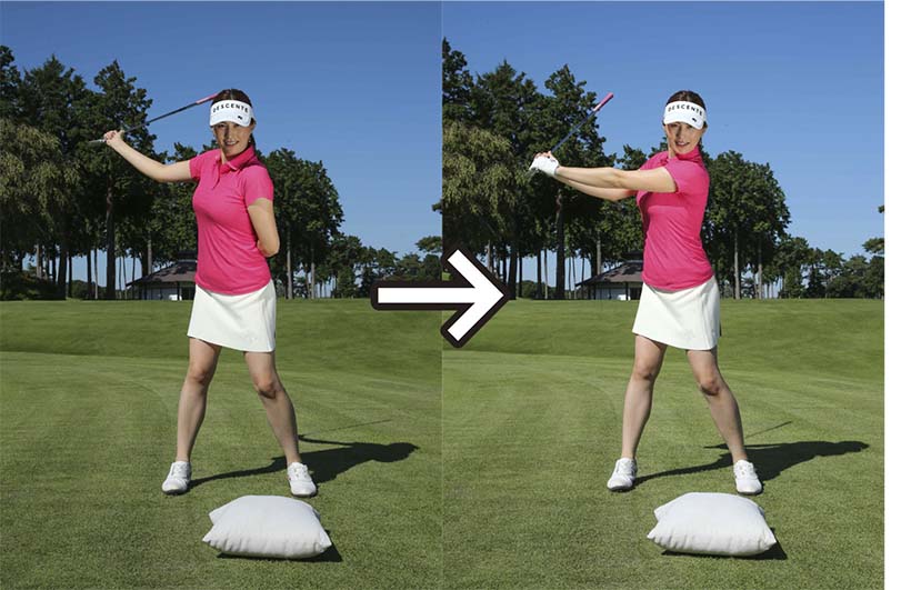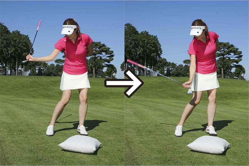 右手でクラブのヘッド側を持ち、クッションを叩いてみよう。自然な動きでクラブが振れて、インパクトの形も安定しやすい。