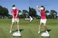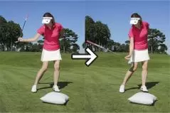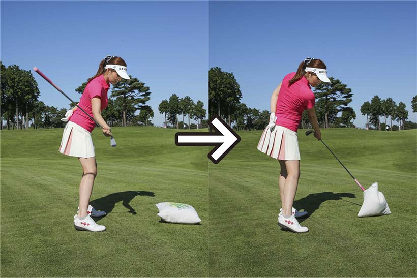 私がレッスンをしているスタジオにはインパクトバッグという練習器具を置いてあります。重量が結構あって、これをクラブで叩いてインパクトのイメージを体感するのにとても効果的です。マットの上のボールを打つときは、初心者と上級者とではスイングに明らかな差が見られますが、「クラブでインパクトバッグを思い切り叩いてください」というと、初心者の人でも上級者とほとんど変わらない動きがすぐにできてしまうんですね。「ボールにちゃんと当てよう」という意識がまったく働かず、本来自分が持っている本能的な動きとか、自然な動きを引き出せるからです。