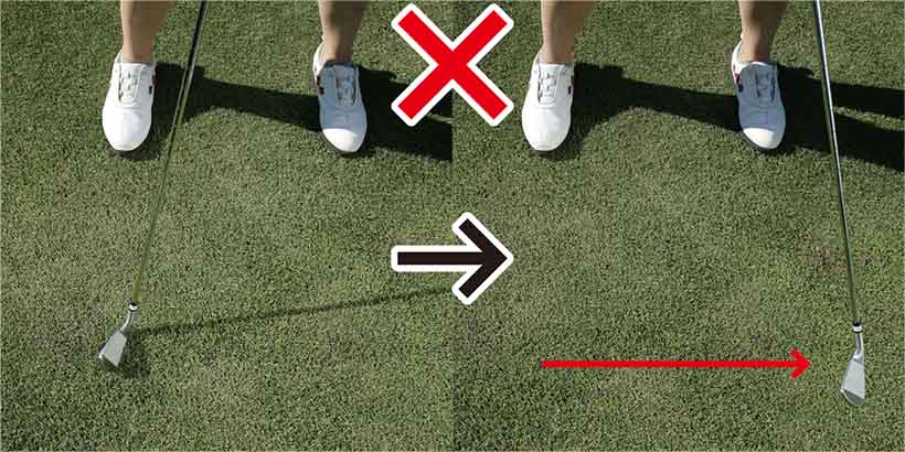 クラブヘッドを芝の上で軽く引きずるように動かしてみてください。右足の外側から左足の外側へと引きずるんですけど、大事なポイントは常に手元を先行させること。クラブヘッドが緩やかなインサイドインの軌道を描くように引っ張って頂くとインパクトのポジションを通過してからフェースが自然に返り、インサイドに振り抜かれることがわかります。インパクトエリアではクラブヘッドが手元を絶対に追い越さないようにする。これが肝心です。