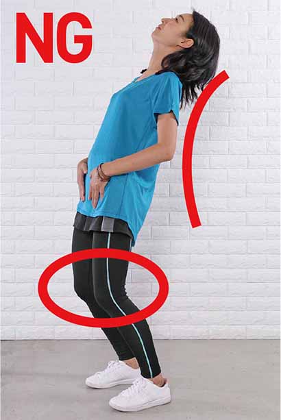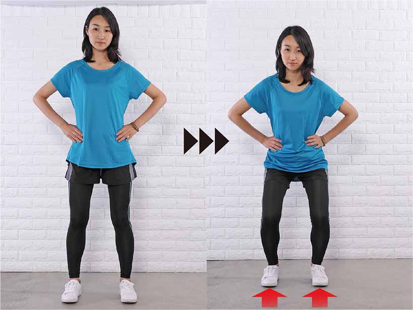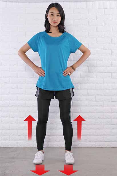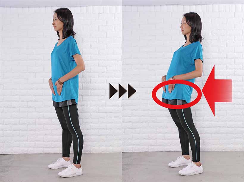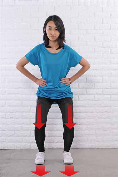 1.足を肩幅程度に開き、つむじを上、尾骨を下にして、背骨をスッと伸ばして立つ。つま先は真っすぐ前に向ける。へそは背骨に引き込み、お腹を凹ませる。骨盤底筋も締めて引き上げ、お腹とお尻の筋肉で骨盤を立てる。手は腰にそえる。