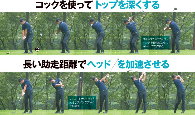 最近はレッスン記事でもコンパクトなトップが推奨され、オーバースイングはよくないといわれていますが、少々なら気にする必要はありません。むしろ助走区間は長い方がダウンスイングに勢いがつき、ヘッドスピードが上がりやすくなります。飛距離を求めるなら、柳沢選手のトップの深さを見習いたいところです。