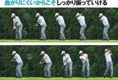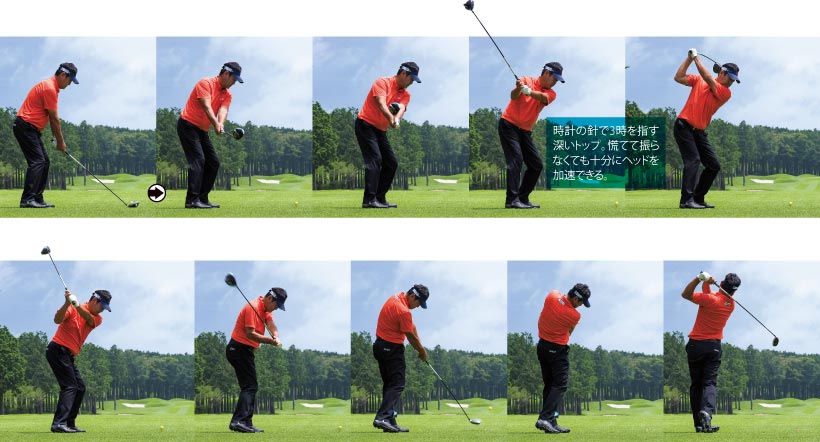 回転を重視した効率のいいスイングで飛ばす倉本選手。コンパクトなトップのノーコック打法は柳沢選手とは対照的ですが、クラブを引き下ろすときの大きなタメが浅いトップで飛ばせる秘密です。連続写真を見ても、ダウンスイングをヘッドから動かすのではなく、ヘッドはトップの高さに置き去りにしたまま手を真下にギュッと下ろしているのがわかります。