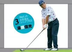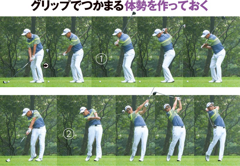 つかまえたいけれどストロンググリップに違和感のある人は湯原選手を参考にしましょう。ウィークで握る湯原選手はつかまる要素として意識的に左の壁を作っています。インパクトで肩が開くとヘッドが外から入ってスライスになりますが、湯原選手は左肩をぎりぎりまで開かないように我慢し、その間にヘッドがグリップを追い越すように戻ってがつんと球をつかまえています。