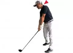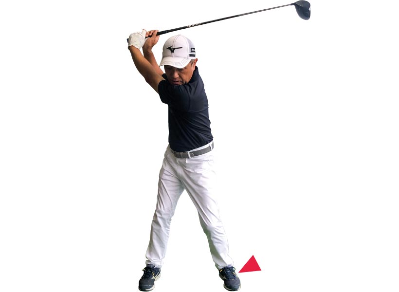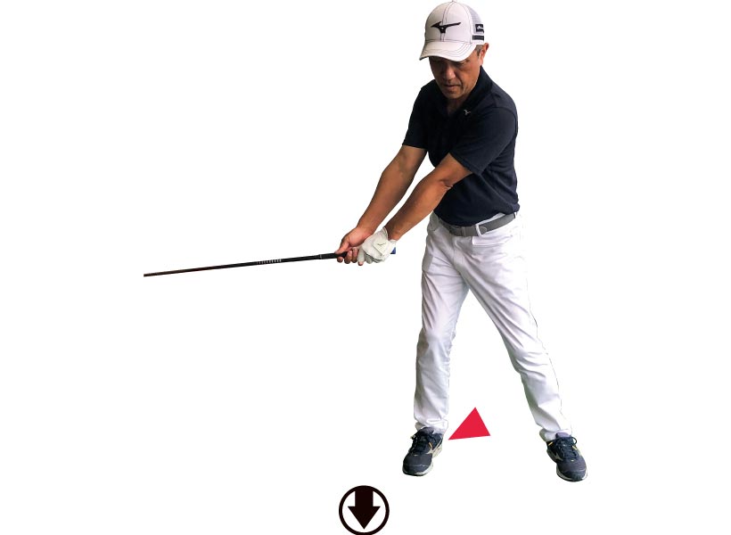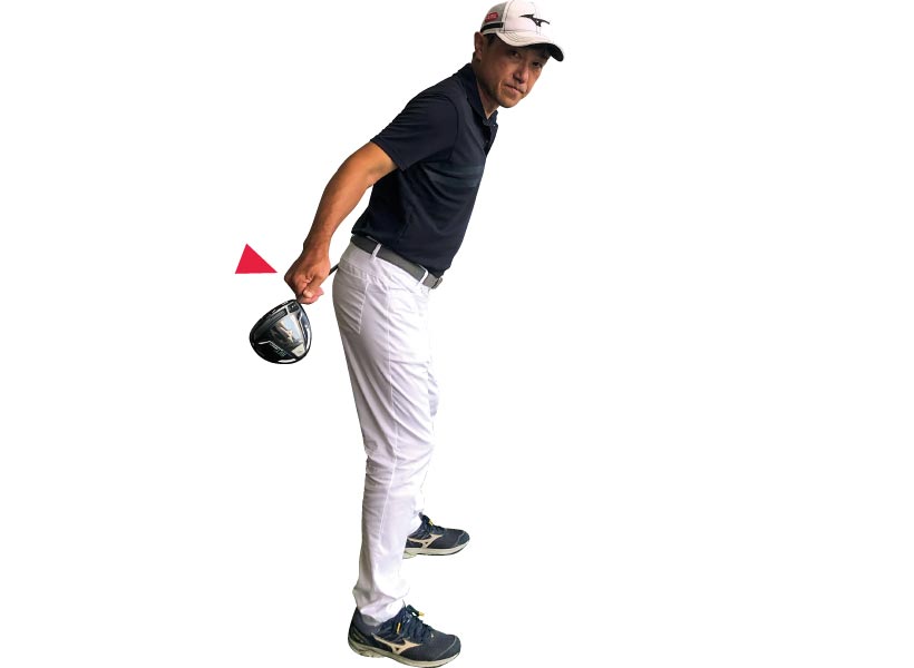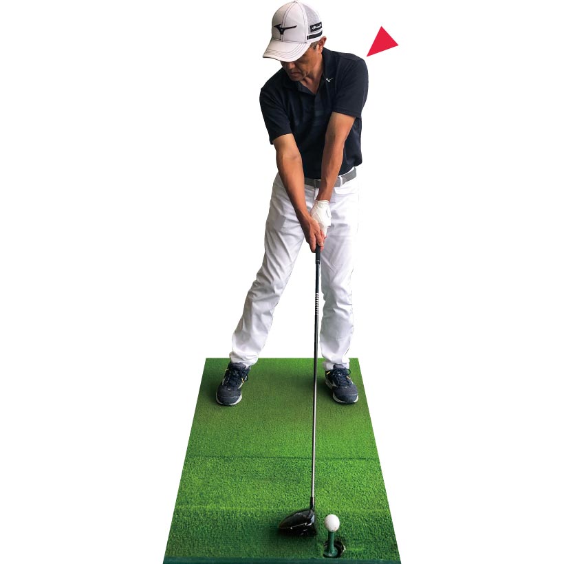 深いトップを作るには、体を無理に回転させる必要はありません。体が固ければ腕をねじってもいいし、柳沢選手のように手首を使ってもトップは深くなります。素振りだと深く入るのに、実際にボールを打つときには手首をロックさせてしまう人が多くいます。グリップをゆるく握ってヘッドを感じながら上げるようにすれば、頭の左横までヘッドが深く入ります。