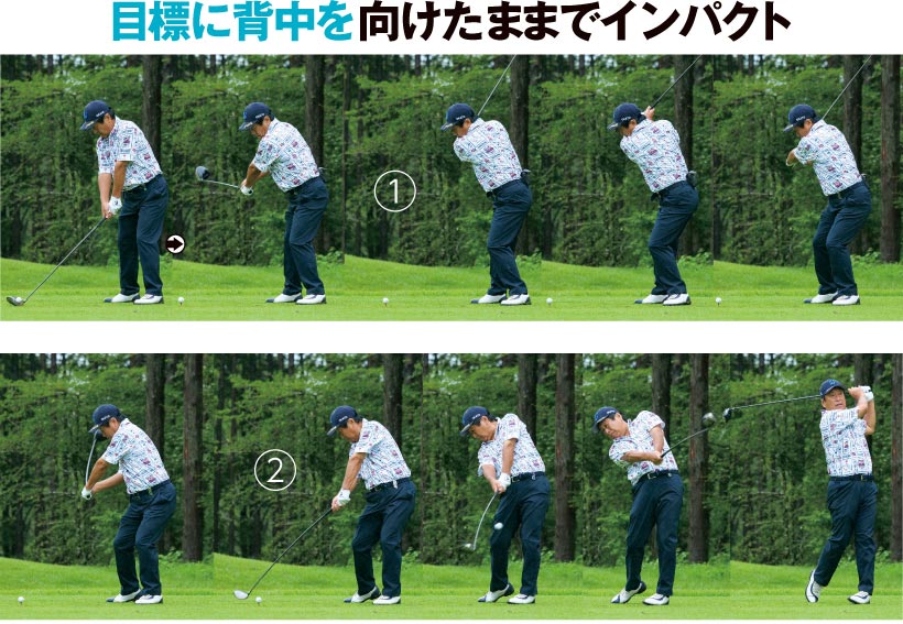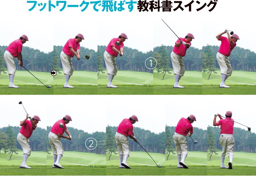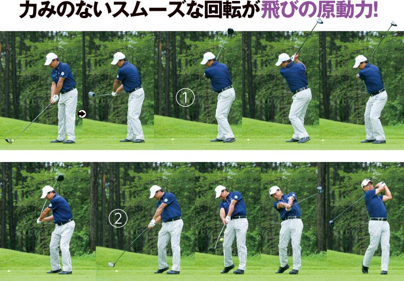 回転で飛ばす倉本選手に対して、フットワークを使って飛ばしているのが尾崎選手です。バックスイングで右に乗って、インパクトで左に戻る感覚では遅すぎます。尾崎選手はバックスイングの初期から完全に右体重にシフトし、切り返す前にはもう左をグッと踏み込んでいます。肩口までクラブが下りたときには完全に左体重にシフトして、インパクトにかけてタメを解放してクラブを走らせています。