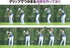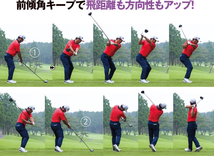 すべてをマネするのは難しいけれど前傾角が変わらないところは見習いたいです。お尻の位置をまったく変えずに振れるのは、リリースのタイミングが合っているからです。リリースが早いとダフるので、それを防ぐために体を浮かせるしかなくお尻は前に出てしまいます。