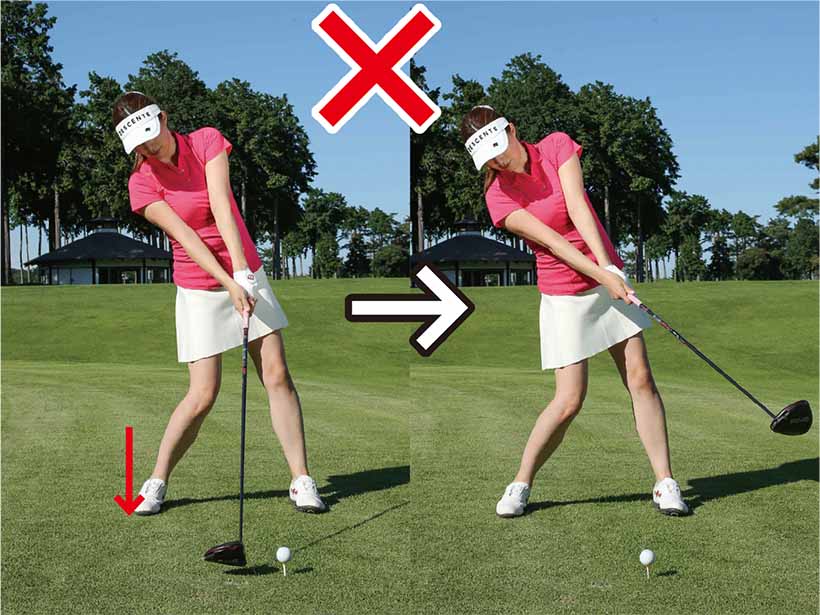 ドライバーの場合、ボールの位置が左足の前に近いですし、ティアップもしていますから、スイング軌道の最下点がボールの手前側となります。アイアンでダウンブローに打つのと同じスイングをしても、ボールの位置が左なら自然にアッパーブローにとらえられるのです。「ドライバーはアッパーブローに打たなくちゃ」なんて考えていては、ボールを下からあおるように打ってしまいます。インパクトで右足体重になり、カラダの左サイドが伸びてしまう人はアッパーブローを意識しすぎるのが原因です。