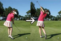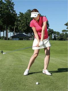 ポイントは両手首を柔らかく使って、両ヒジをなるべく下に向けたままで腕を振ること。実際にやってみるとわかりますが、ワイドスタンスに構えると下半身の動きが抑制されて、カラダの回転が結構きつく感じられます。それでもクラブヘッドの運動量を増やしてあげるつもりで、腕をしっかり振りましょう。