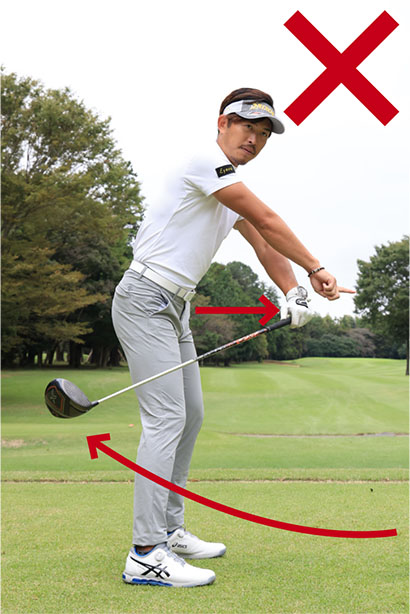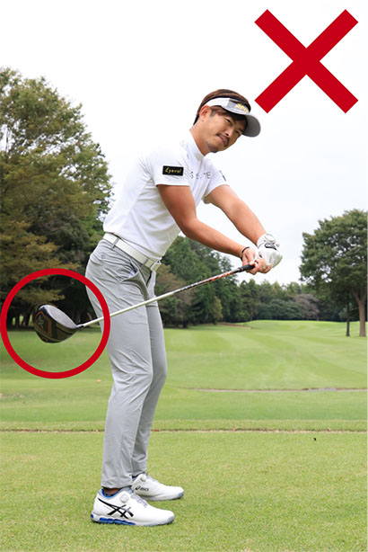 ところが実際はどうでしょうか。今どきの「曲がらない」、「真っすぐ飛ぶ」が謳い文句のはずなのに、やっぱりスライスが出てしまうと悩んでいませんか? 僕のところにも「スライスが直らないんだけど、どうすればいい?」と訊ねてくる方も多くいらっしゃいます。どうしてスライスが生じるかというと、一番の要因はテークバックでフェースを開きすぎてしまうこと。グリップをカラダからなるべく離さないで、クラブヘッドをカラダの外側に上げるのが正しいテークバックなのに、グリップがカラダから 離れるとクラブヘッドをインサイド方向に低く引いてしまうことになります。