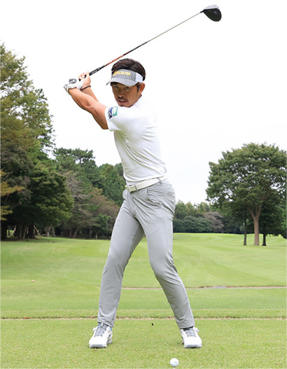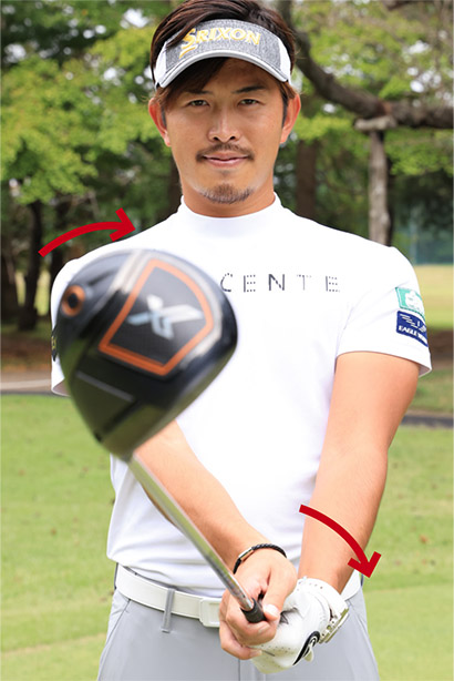 実際のテークバックはクラブヘッドの重心移動や慣性モーメントでフェースは自然に開きます。でも今どきのドライバーはフェースの開閉を使わないのが合理的ですし、意図的にフェースを開こうとしたり、インサイドに上げようとしたりしないほうがいい。そうした意味でも左腕のちょいヒネリでフェースをシャットに上げていく感覚を大事にしてください。これで今どきのドライバーで気持ちよく飛ばせるようになりますよ。
