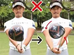 テークバックで左ヒジから先の「ちょいヒネリ」を入れれば、インパクトでフェースが絶対に開かない!