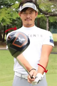 では、今どきのデカヘッドで真っすぐ飛ばせるようになるコツをお教えしましょう。難しいことは何もしなくて結構です。テークバックで左腕に「ちょいヒネリ」を加えるだけです。アドレスを作ったら、テークバックのときに左の前腕部を少し「外旋」させるのです。外旋とは自分から見て左側に回す動きのことで、左ヒジから先をちょっとヒネるだけでフェースの開きを完璧に封じ込むことができます。