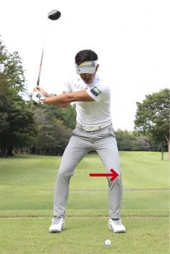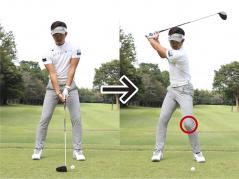 飛ばない人にとくに多く見られるのが、バックスイングで左ヒザが右ヒザに近づいてしまうパターンです。こうなると腰と肩の回転差が生まれず、深い捻転が作れません。上体がスムーズに回転しているように見えても上体と下半身のネジレが作れず、飛ばしのパワーが蓄えられないのです。下半身の踏ん張りがきかないため、ダウンスイングで左腰が引けたりカラダが早く開いたりしてフェースの芯でとらえにくくなります。