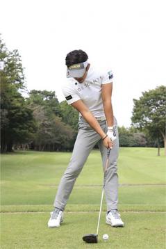 バックスイングの決め手は「ガニ股」のキープです。バックスイングでは上体の回転に引っ張られて左ヒザが多少は右側に動きますが、なるべく右に流れないように我慢しましょう。そうすれば上体と下半身の回転差が生まれて、腹筋や背筋などの体幹部に強いネジレが感じられます。両足をしっかりと踏ん張り、体幹部に強いネジレが生じたらトップはコンパクトでも構いません。あとはカラダの捻転をほどくだけで、切り返しでは左ヒザが先に戻り、その流れでカラダがフィニッシュに向かって一気に回転します。バックスイングがガニ股なら、ダウンスイングもガニ股というわけです。インパクトまで右カカトがなるべく浮き上がらないように我慢し、ボールを打ち抜いてから上体の回転に引っ張られて右ヒザと右足が動いていくというイメージです。