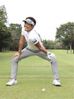 バックスイングやダウンスイングのガニ股キープが自然にできるようになるには、開脚ストレッチがとても有効です。皆さんもよくご存知の両足を左右に大きく広げて腰を十分に落とし、上体を左右交互にヒネるストレッチです。一番の目的は股関節の柔軟性を高めることですが、バックスイングで左ヒザを右ヒザに近づけないで、むしろ右ヒザから離す感覚のマスターに役立ちます。上体を反対側にヒネればダウンスイングで右ヒザをなるべく動かさないで、右足を我慢しておくイメージにつながります。下半身の強化トレーニングをとくにやらなくても、このストレッチを日課にするとガニ股のバックスイングが自然になじんできて、ビックリするくらいドライバーの飛距離がアップしますよ。