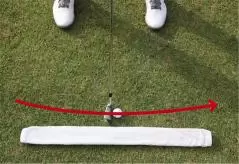 そこでオススメしたい練習法がこれ。まずスポーツタオルを用意してください。タオルを縦に折って、細長い帯状にします。そして飛球線と平行となるように地面に置きます。ボールとタオルの間隔は5センチ程度、アドレスしたときにクラブヘッドの先端からタオルが少し離れるくらいまで近くに置きましょう。そしてクラブヘッドがタオルに触れないようにボールを打つのです。練習場のマットの上で練習するときもタオルを活用するのがいいでしょう。クラブやアライメントポールではクラブヘッドが当たったときに危険ですから避けましょう。