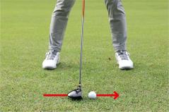 最後にちょっとした基本的なポイント。フェアウェイウッドでもロフト角の少ない3番ウッドは、ヘッドスピードがあまり速くない人にとってはボールが上がりにくく、難しく感じられるでしょう。ロフトが多めの5番ウッドを多く練習して自信をつけてから3番ウッドにトライしてみるのがいいと思います。ミート率を上げるにはクラブを短めに持つのもいい方法です。またフェアウェイウッドのボールの位置は、ドライバーよりも1個くらい内側が基準です。ボールを右に置きすぎたり、左すぎたりするとその度にスイング軌道が変わって、ショットの方向が安定しませんから、ボールの位置を統一させることが大切です。