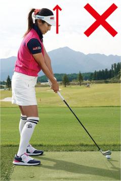 またボールから離れすぎたアドレスもシャンクの原因となります。ボールがカラダの遠くにあるため、バックスイングで頭が下がってカラダがボールに近づきやすく、その反動からダウンスイングでは上体が起き上がりやすい。するとどうなるかというと手首が早くほどけて両腕が伸びてしまい、結果としてネックにボールが当たりやすくなるんです。ボールの近くに立ちすぎてシャンクが出るケースもありますが、どちらかといえば遠くに立ちすぎる人がシャンクになりやすいといえます。シャンクは一度出ると続けて出てしまうケースが多く、クセになると厄介です。早めにスイング矯正につとめましょう。