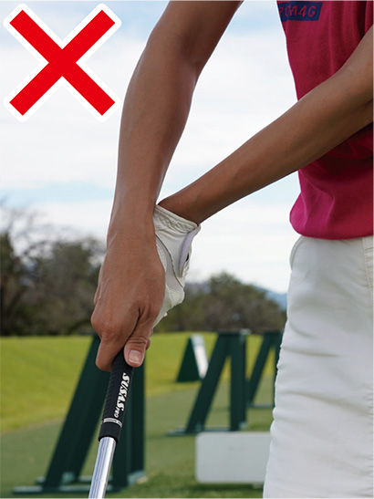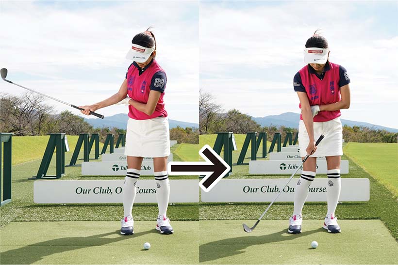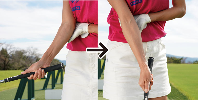 左手を右ヒジに添えて固定し、右手首の角度をキープして打つ。インパクトの打点が安定してチャックリを解消。