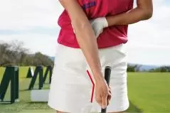 アプローチのチャックリ病を直すには、右手打ちドリルが最適です。クラブを右手だけで持ってボールを打つ片手打ちの練習です。まず通常のアドレスを作り、左手をグリップから離して右ヒジの下から左手を添えて固定します。ボールの位置はカラダの中心線の前で、右手は左モモのツケ根の前にセットして軽くハンドファーストに構えましょう。そして右ワキをほどよく締め、右ワキを下に向けたままでスイングし、ボールを打ちます。右ヒジを支点にしてクラブを振るという感覚です。