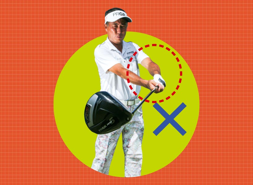 左ワキの下側にシャフトを強く当てるつもりでスイングするのがコツ。