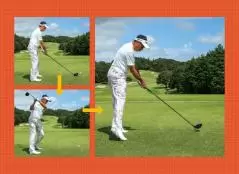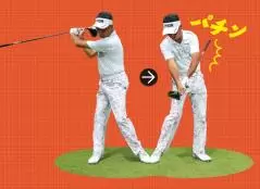 ポイントは左ワキを締めて手よりもヘッド側を早く戻すイメージでクラブを振り下ろすことです。ヘッドの近くのシャフトを持って素振りしてみてください。シャフトが左ワキに当たらないようでは手が先に行きすぎている証拠。シャフトが軽く当たる程度でもNGです。インパクトの少し前にシャフトで左ワキに強く叩けるのが正しい動きです。ただし左ワキの上側に当ててはダメです。手元が浮いてフェースが開いてしまいますから、ベルトの近くの左ワキに当てるようにしましょう。