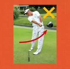 これを直すにはツマ先体重気味に構えましょう。通常は土踏まずから母趾球にかけての部分に重心を乗せますが、もう少しツマ先側に重心を意識するのです。アドレスを作る手順としては両足をツマ先立てて両ヒザを伸ばし、両足のカカトを静かに下ろして最後に両ヒザを軽く曲げましょう。そしてスイング中は重心の前後移動をなるべく抑えて、インパクトでは左ツマ先でしっかり踏ん張るようにすることです。