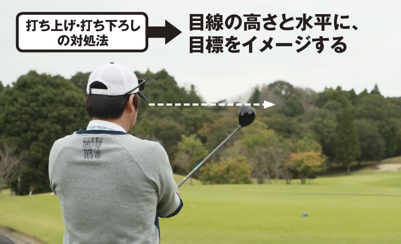 対策は、傾斜に影響されないように、自分の目線の高さに目標を定めることです。ボールの後ろに立ったときに、目線の高さにクラブヘッドを合わせて、その先の目標をイメージします。この段階で、弾道のイメージをしっかり作ることが、ナイスショットにつながるのです。