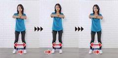 7.次は、右足を右ななめ前に1歩→左足を真っすぐ前に1歩。これで1セット。リズムよく、10回繰り返す。