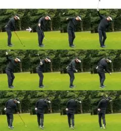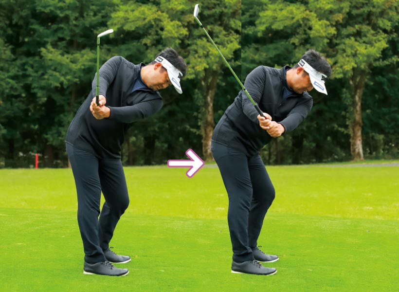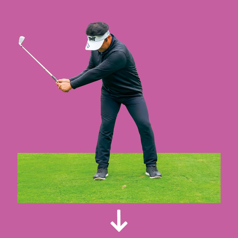 テークバックからバックスイングでは能動的にクラブを上げない。前傾した状態で左肩が下がり、右肩が上がることでクラブは勝手に上がる。