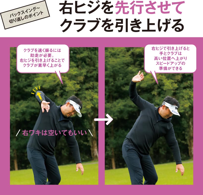 野球のピッチングやテニスのショットではヒジを先行させて動くがスイングも同じ。右ヒジを先行させないとヘッドスピードが上がらない。
