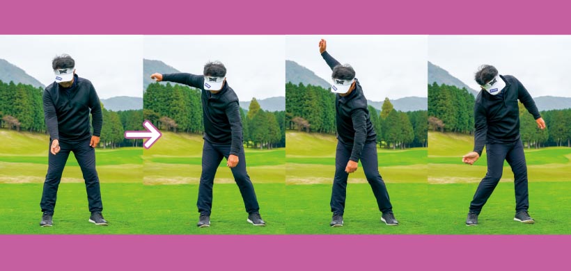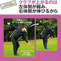 これを左側屈といいますが、この動きがあると手先を使わなくてもクラブが上がっていきます。裏を返せば、手を使って能動的にクラブを上げなくてもいいわけで、右手一本でクラブを引き上げていくのと同じ動きになります。