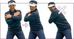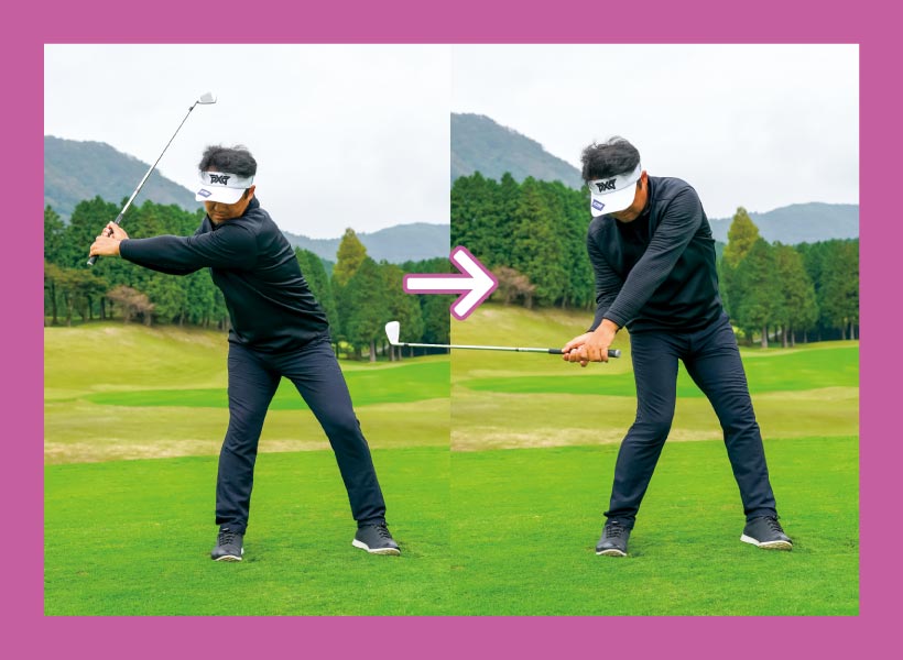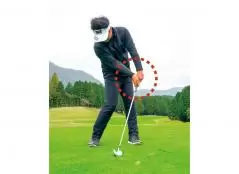 気をつけてほしいのは、手だけで左ハンドルをきらないこと。左右の手が交差し、フェースだけがかぶってしまいます。これを防ぐにはクラブと体の関係性を変えずに左ハンドルをきること。これができると正面から見て左肩が下がって右肩が上がり、肩がタテに回る格好になります。