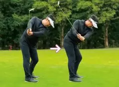どう振るかといえば、手元を先行させる。右手でクラブを引っ張り上げるように動かし始め、下ろしてくる時も手を先行させる。速く振ろうとするほど、この傾向は顕著になります。
