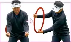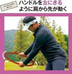 文字通り、車のハンドルを左にきるように手を動かすわけですが、こうするとクラブヘッドが手元より遅れて動き始めます。と同時にシャフトに左回りのトルクがかかってフェースが閉じる方向に動きます。左ハンドルをきることで、右手一本の理想的な動きを再現できるわけです。