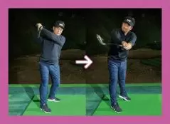 右手一本スイングの初動を両手で行う場合、私は「左ハンドルをきるようにテークバックしてください」と伝えます。