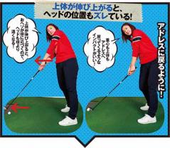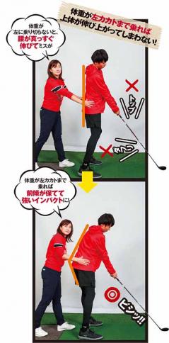 「重心が右足に残ったままで、上体が伸び上がってしまうようなインパクトを修正しましょう」(志賀友香プロ)