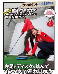 Point! 左足のツマ先までではなく、左足のカカトまで体重を乗せて!左足でディスクを踏んでインパクトを迎えましょう。