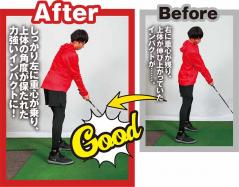ダウンスイングから左足のカカトまで体重を乗せていくことで、しっかりと左に体重が乗り、上体の前傾が保たれた力強いインパクトに変身!