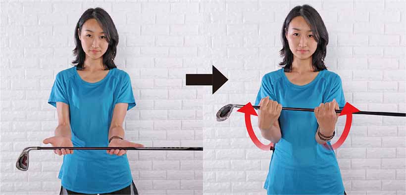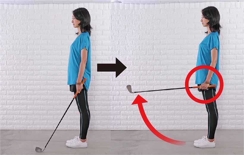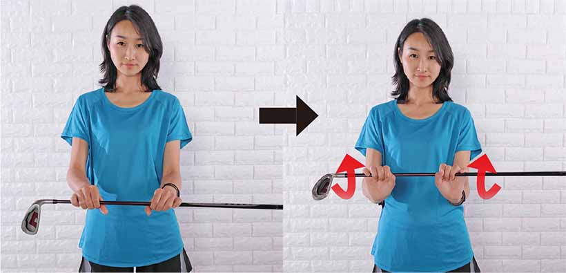 2.両ヒジを曲げ、両手のヒラを上に向けて脇を締め、クラブを軽く持つ。鼻から息を吸ってスタンバイ。