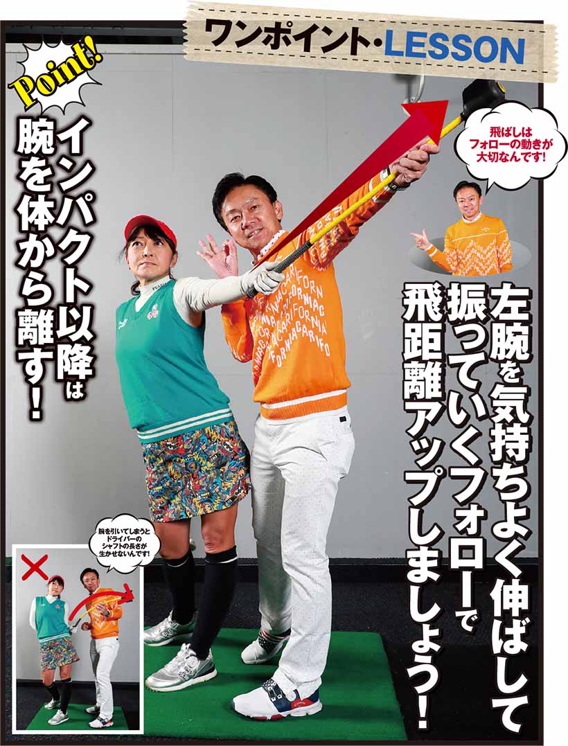インパクト以降は腕を体から離す! 左腕を気持ちよく伸ばして振っていくフォローで飛距離アップしましょう!