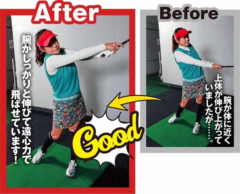 写真 右)フォローで左腕を伸ばしていった方がヘッドが走る感覚がわかります!
